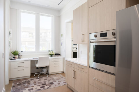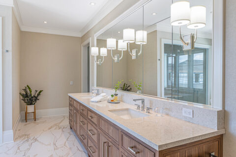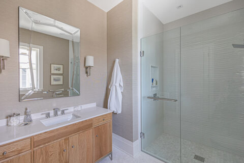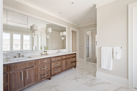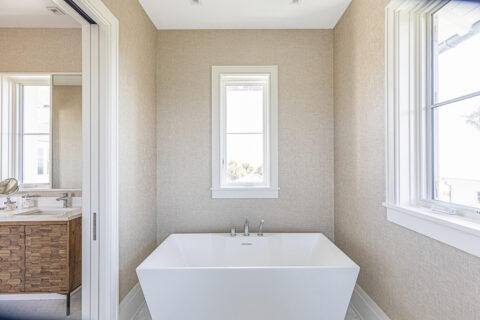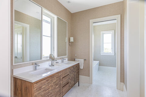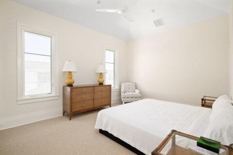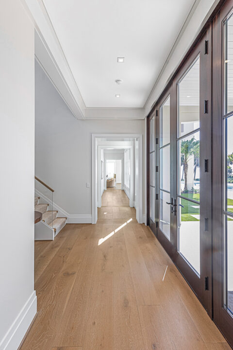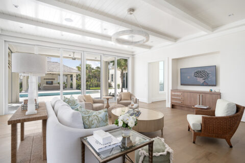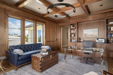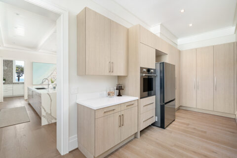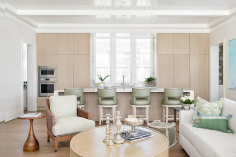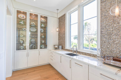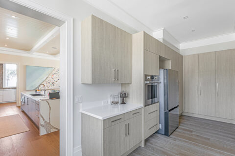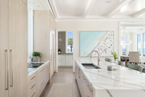 Not to be outdone by the allure of the outdoors, the impeccable interior design and exquisite finishes create a warm and welcoming atmosphere that will make someone right at home. The primary level is comprised of an open living room/kitchen area that features top-of-the-line appliances and custom millwork that sets it apart. Culinarians will rejoice in the gourmet kitchen, complete with expansive island and additional seating, paneled Sub-zero refrigerator, and top-of-the-line amenities. Host dinner parties from a seafront dining area, and open the floor to ceiling sliders that give way to a covered porch when entertaining guests. A stunningly appointed bar pantry provides additional prep space with beverage center, elegant shell detailing, and ample storage. For added convenience, butler pantry with outdoor entry adjoins the kitchen and hosts a built-in desk, oven, refrigerator, and additional storage that lends to the functionality and convenience of this stunning home.