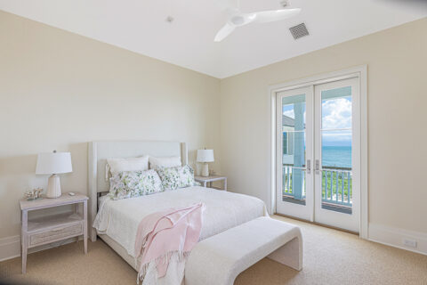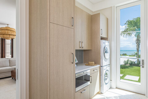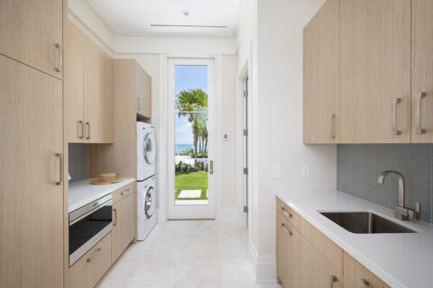 An elevator conveniently connects the two floors, while a staircase with appealing glass-accented railing provides traditional access. The striking master wing exudes cool appeal, with a bright bedroom suite that drinks in sea views from multiple exposures, and a sumptuous bathroom with spa shower, soaking tub, dual vanities, and exceptional walk-in closets. A handsome, warm wood-accented office with custom built-ins hosts with its own covered oceanfront balcony. Leaving no detail to chance, a wet bar off of the office and bedroom comes complete with beverage center, microwave, and storage – adding to a lengthy list of luxurious convenience. Additionally, a bunk room, laundry room, and exercise area ensure that everyone has their own space to relax and unwind.